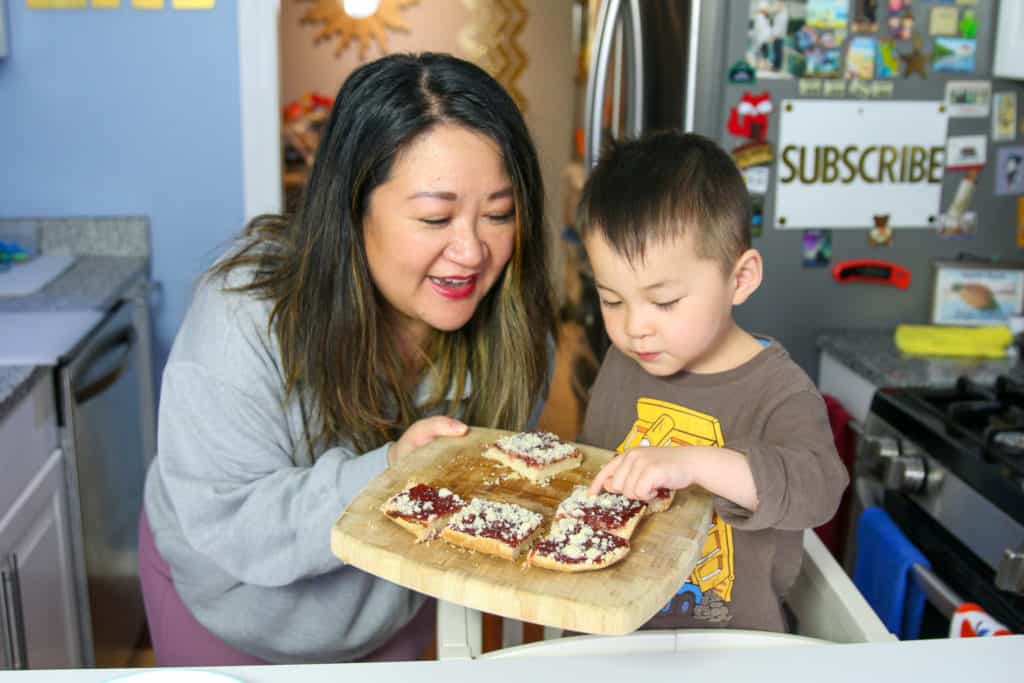 The taste test part of the video was something I was curious and a little anxious about because toddlers do NOT hold back their true reactions when it comes to food they don’t like. I figured that even if he didn’t like it, I’d just roll with it because I KNOW these bars are really good. I mean…c’mon…buttery shortbread and jam? What’s not to like?