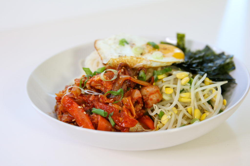 The combination of the crunchy seasoned soybean sprouts, tender octopus, and chilled noodles together will make your tastebuds dance. And don’t skip out on the shredded roasted seaweed or fried egg!
