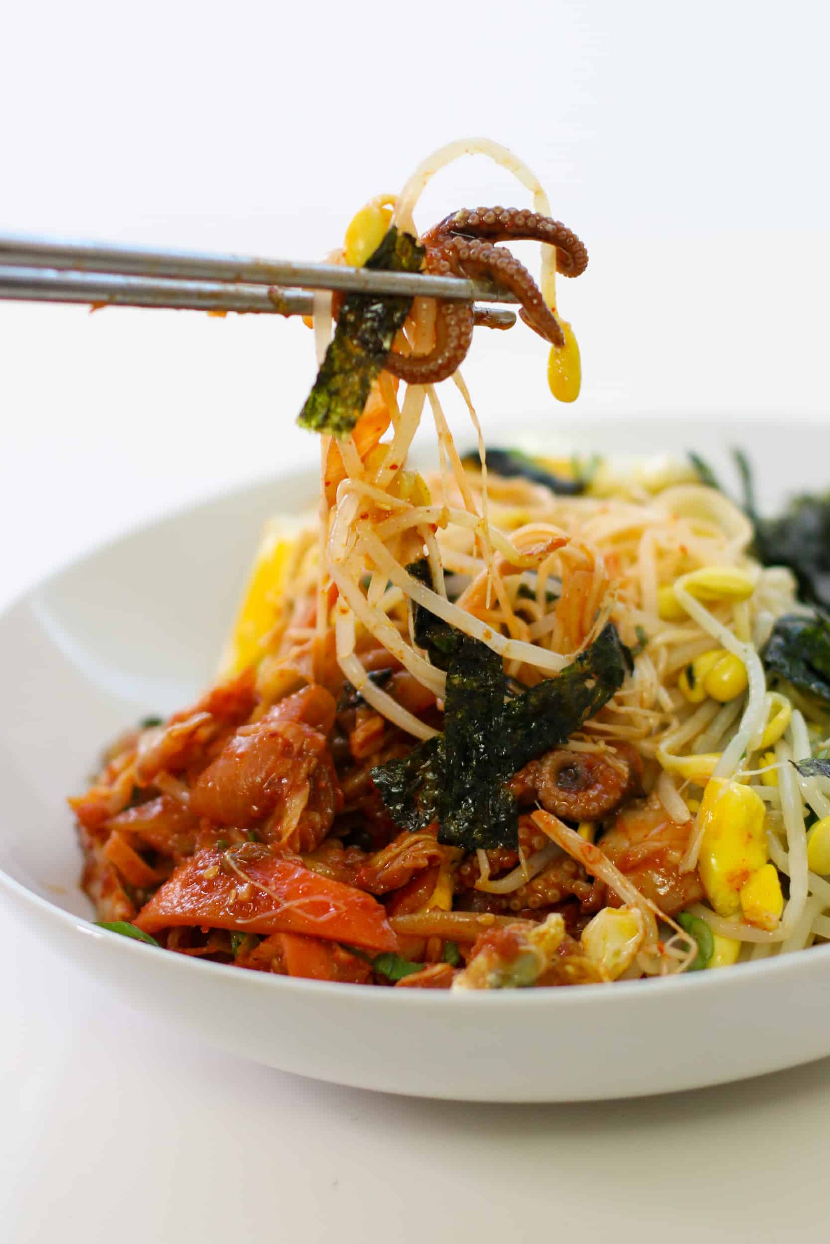 - In the same pan, add a little more vegetable oil and heat over medium high. Add the vegetables and cook for about 5-7 minutes or until crisp-tender. Once softened, add the octopus with sauce as well as most of the scallions (hold some back for garnishing at the end). Coat the vegetables with the sauce and cook for 3-4 minutes on high. Do not overcook the octopus or it will get tough. Turn off heat and add the last 2 teaspoons of sesame oil. Toss to incorporate. Garnish with leftover scallions and sesame seeds if desired. To serve, add noodles, beansprouts, shredded roasted seaweed, and as much of the octopus mix as desired in a bowl. You will probably have some leftover. Top with a fried egg and garnish with chopped scallions and sesame seeds.