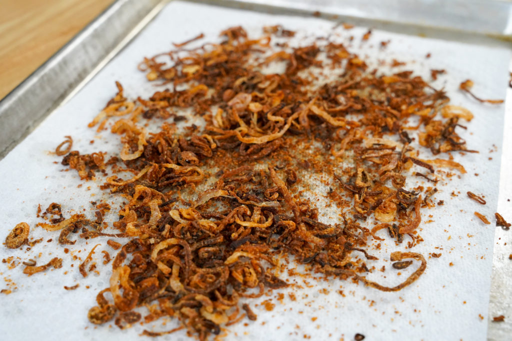 - In a bowl, mix 2 tablespoons flour, ¼ teaspoon fine salt, and ⅛ pepper in bowl. Heat 3 tablespoons oil in a 12-inch nonstick or cast iron skillet over medium-high heat until smoking. Toss shallots in the flour mixture, shake off excess flour, and add to the oil. Cook, stirring frequently, until golden and crisp, about 5-7 minutes, or until golden brown and crispy. Keep an eye on on them so they don't burn. Transfer fried shallots to a baking sheet lined with paper towels.