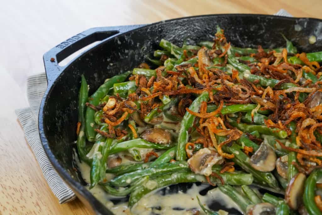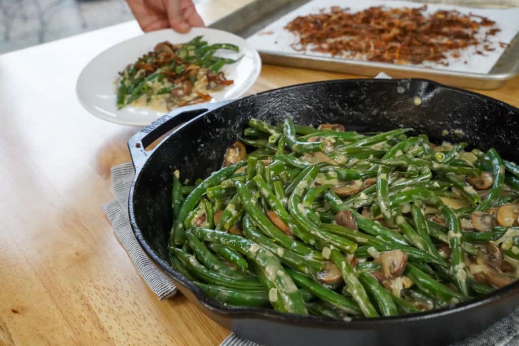 To make this Skillet Green Bean Casserole, I used a 12″ cast iron skillet like this one. It helps retain the heat of the green beans longer and looks beautiful for a stove top to table experience. And for any of the tools I used in our video, you can check out our tool kit. By the way, even though this post is not sponsored, I did use affiliate links, which means I earn a small commission if you do end up purchasing any of these products mentioned at no extra cost to you. I’d be happy to answer any questions for you about these products.