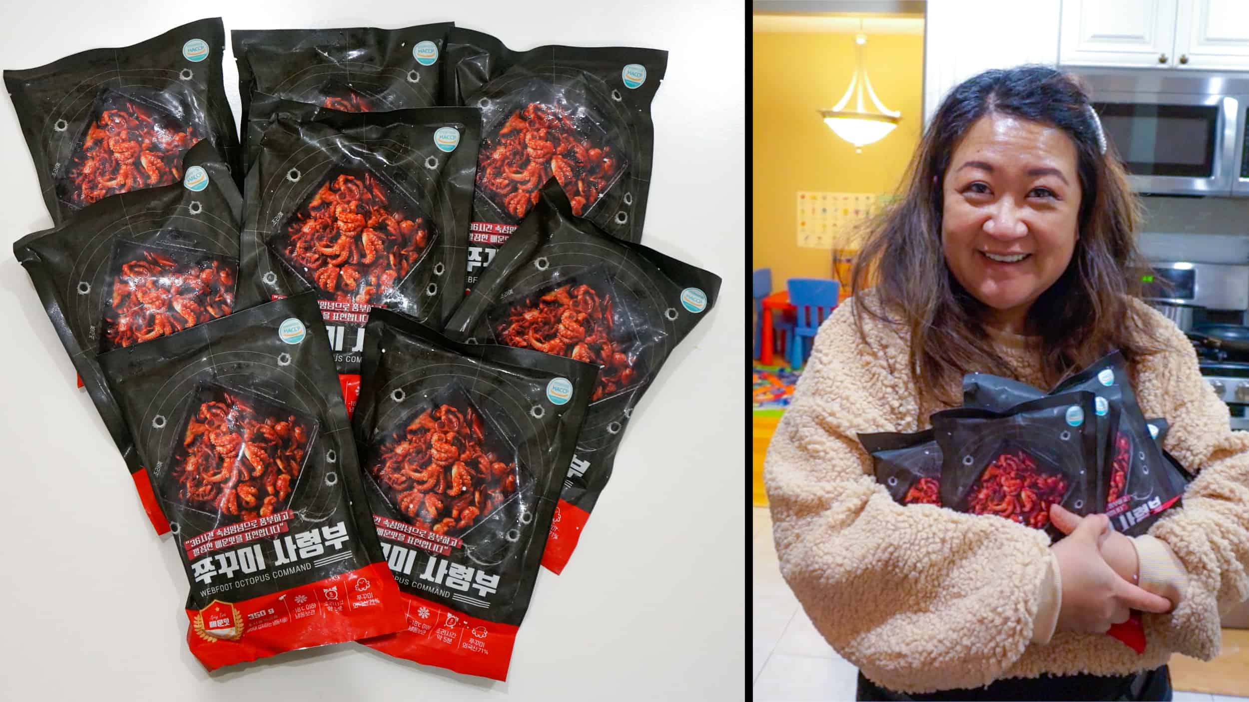 In case you’re wondering, baby octopus is just the name for several species of full grown adult octopus because of their small size. And they are marinated raw for 36 hours in a fiery sauce made of Cheongyang peppers, the hottest peppers in Korea and ripe jujube fruit! If you want inspiration on how to use these kits, watch our VIDEO and get the RECIPE here: Spicy Octopus Stir Fry with Noodles Recipe