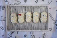 Reheat remaining melted wafers and place in a piping bag or Ziplock bag folded over a tall glass to allow for easy pouring. Tie the top with a rubber band to secure it, and then snip off the tip of the bag (make sure the hole is pretty small so the lines aren't too thick). Drizzle "bandages" all over the cookies in a loose zig zag pattern and quickly place candy eyes on top before the chocolate hardens.