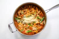 Add the rest of the cabbage. Make a well in the center. Raise the heat to medium-high. Add a little oil, along with the chicken and all the sauce. Cook for about 3-4 minutes, stirring occasionally to let the chicken start cooking. Incorporate the cabbage into the chicken. Lower the heat and add the rice cakes and cook until the chicken is cooked, and the potatoes and rice cakes are soft, but not mushy, another 3-5 minutes. You don’t want the potatoes to break down too much, or the sauce will get starchy. You can add a splash of water or chicken broth to the pan if it looks too dry.